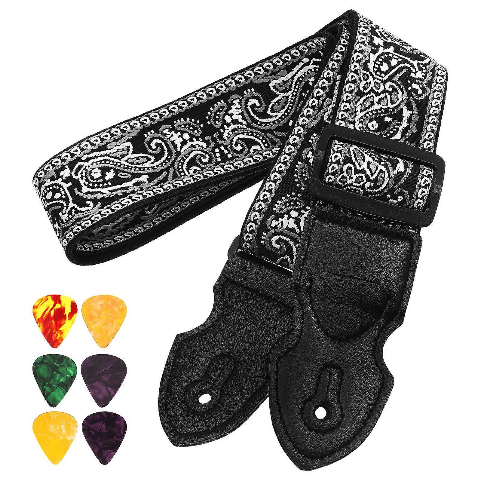 Description Introducing our guitar strap, designed with intricate embroidered patterns. This guitar strap is not only fashionable but also strong and lightweight, ensuring long-lasting comfort during your performances. The guitar strap set includes multiple picks, allowing for easy accessibility. Features -Color:Assorted color -Material:ABS, polyester -Size: 88.00X5.80X1.50cm/34.58X2.28X0.59in - Unique pattern: The electric guitar strap features a unique embroidered pattern design that is fashionable and eye-catching - Includes picks: The acoustic guitar strap set also includes multiple picks that are convenient to use and suitable for long time use - Adjustable design: The guitar strap comes with an adjustable strap rope that is easy to carry and adjust the length to fit your needs - Sturdy and lightweight: The guitar strap is made of ABS and polyester materials that are lightweight, comfortable, and not easily deformed - Widely applicable: The guitar strap is suitable for electric guitars, acoustic guitars, basses, providing a comfortable playing experiencePackage list: 1 x guitar strap 6 x picks(random color) 1 x strap rope