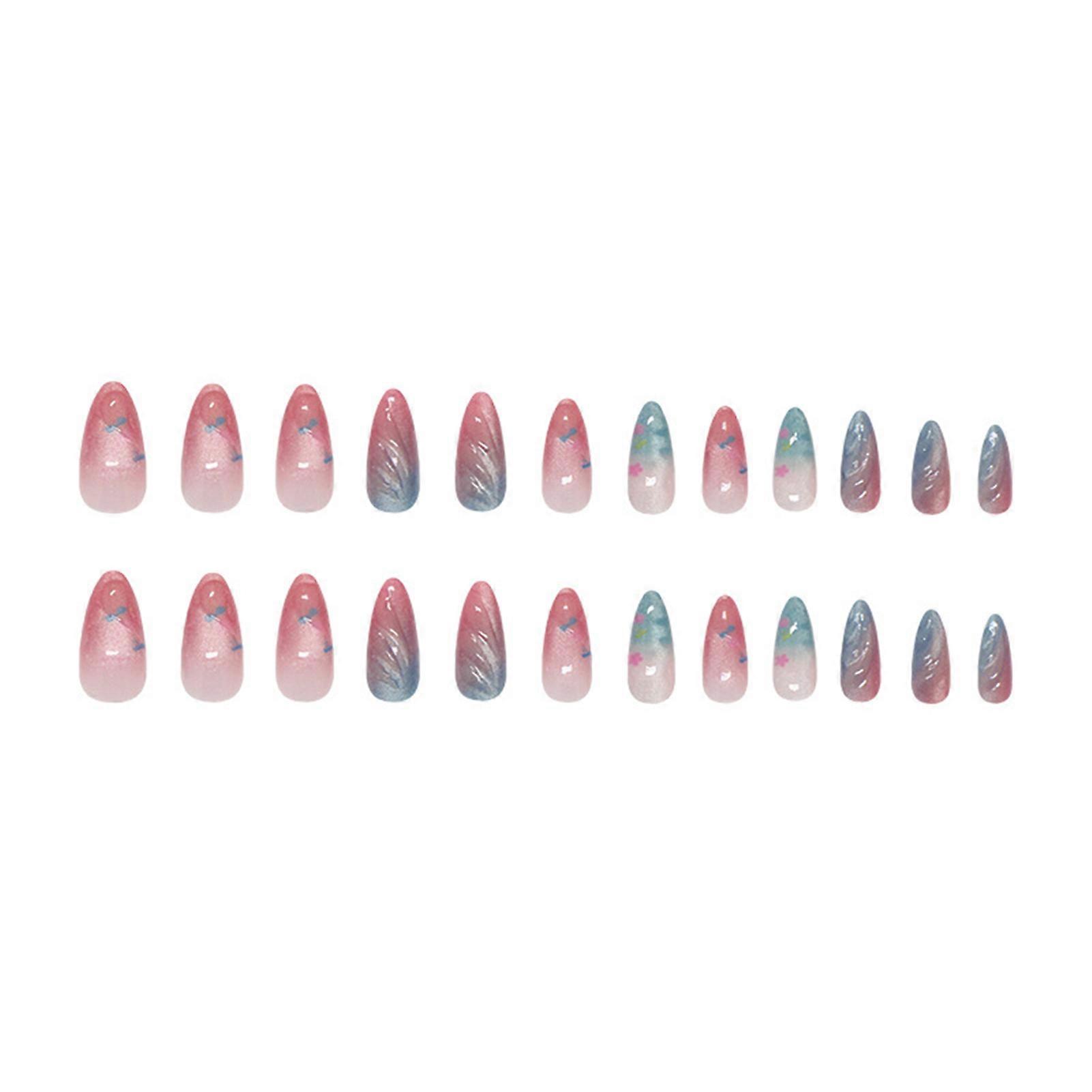 Features: 3D Blue Pink Gradient Design: These artificial nails feature a stunning 3D blue pink gradient effect with glitter cat eyes, creating a mesmerizing and trendy look for any occasion, from holiday parties to daily wear. Water Ripple & Glossy Finish: Each press-on nail is adorned with elegant water ripple decor and a high-gloss finish, adding a touch of sophistication and uniqueness to your manicure without the hassle of salon visits. Comfortable & Zero Pressure: Designed for a snug fit, these false nails provide zero pressure on your nail bed, ensuring all-day comfort while maintaining a lightweight feel for easy wear. Easy Application & DIY Friendly: With a simple stick-on process, these fake nails are perfect for DIY manicures, offering a quick and hassle-free way to achieve salon-quality nail art at home. Seasonal & Versatile Style: Ideal for spring and summer, these charming 3D nail art decorations come in 24PCS, providing endless matching possibilities for women and girls to express their personal style. Specifications: Material: Resin Quantity: 24PCS Notice: 1.Actual color may be slightly different from the image due to light effect. 2.Please allow 1-3cm deviation due to manual measurement. Include: 1 Set * False nails (24pcs included) 24 PCS * Jelly glue 1 * Nail rub strip