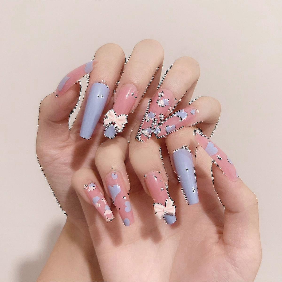 24pcs Love Heart Printed Nail Patch Glue Type Removable Long Paragraph Fashion Manicure Save
