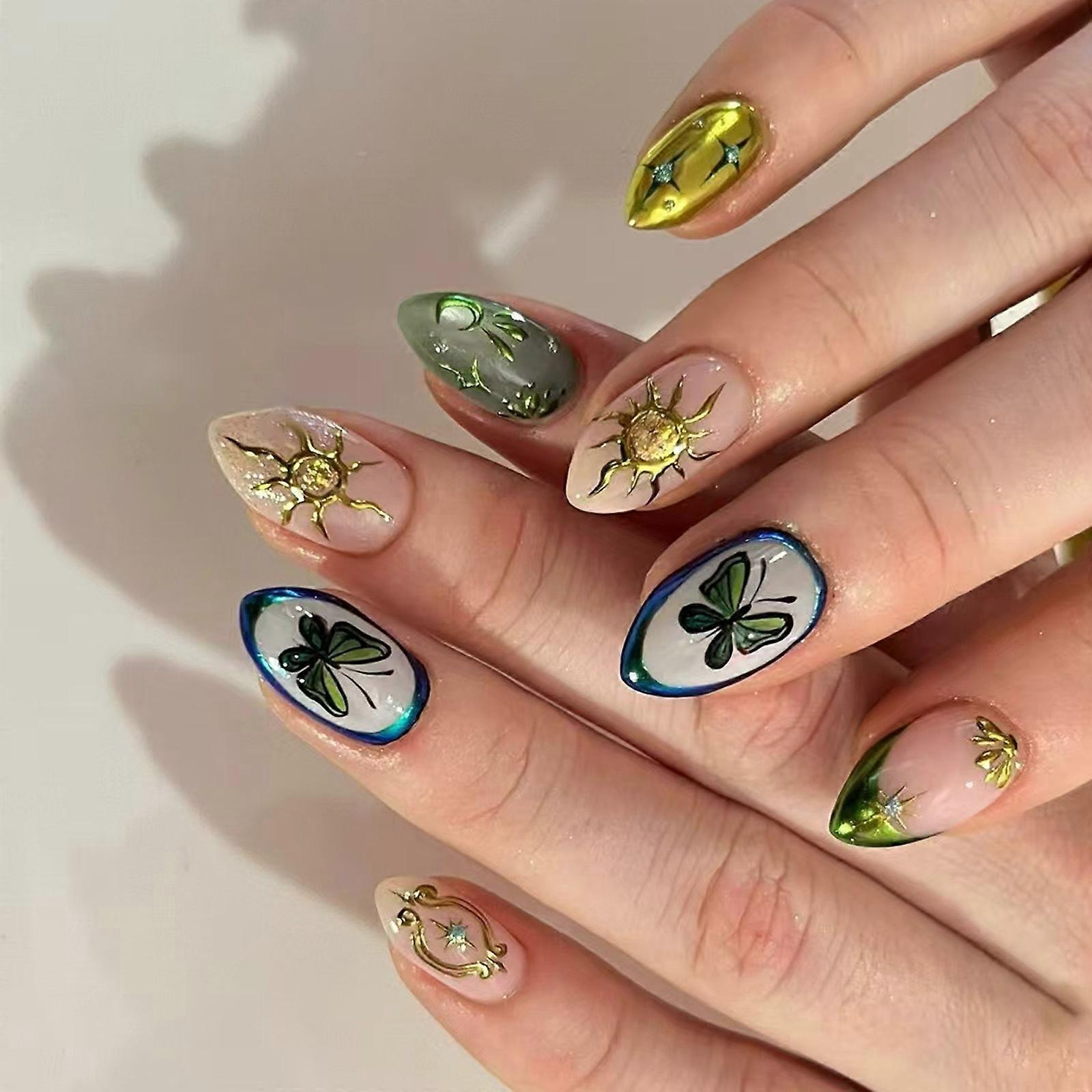 30Pieces Glittering Artificial Nail with Elegant Butterfly Design Shining Color Fashion Nail Art for Women Girl Wear Multicolor