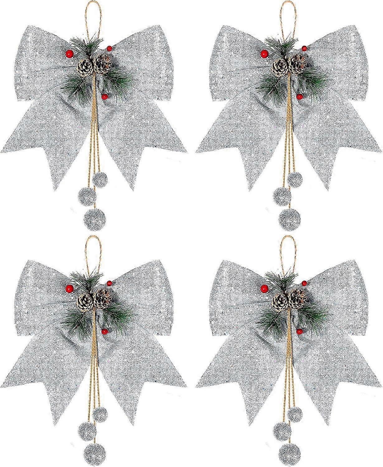 4pcs Christmas Bow, Silver Wreath Bows, 9.8 x 11.8 Large Glitter Ribbon Bow, Large Xmas Bows, Wreath Ornament Decor for Tree Party
