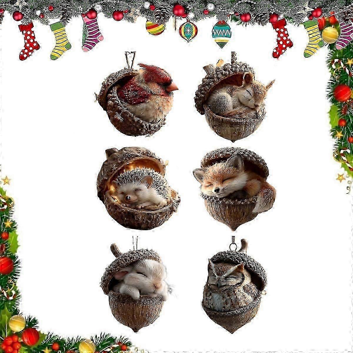 6 Forest Animal Acorn Ornaments Set Cozy Forest Christmas Ornaments, Pine Cone Animal Decoration, Lovely Sleeping Animal Acrylic Christmas Tree Ha