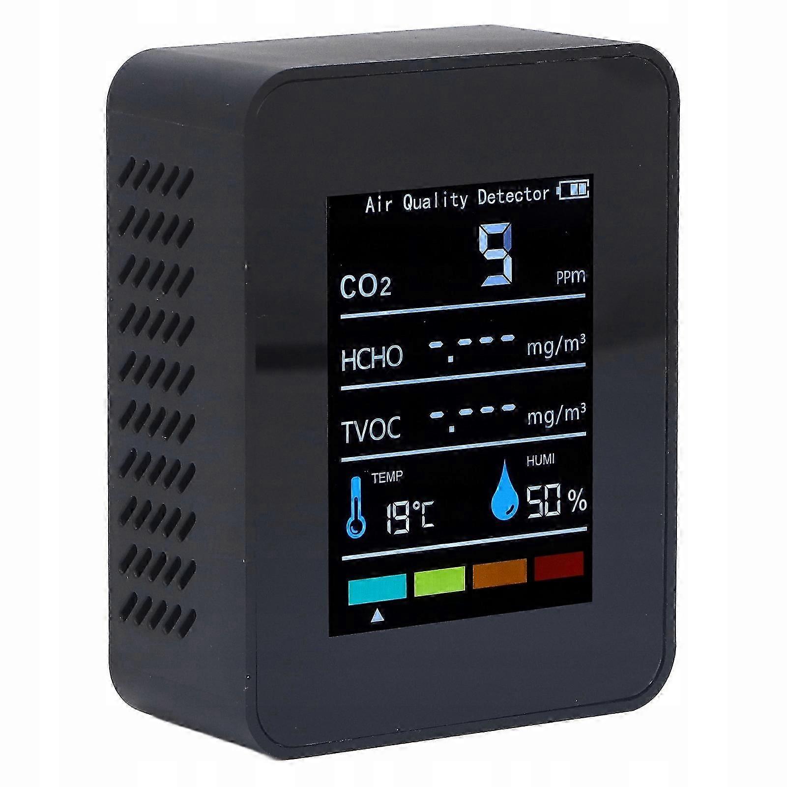Function: 1. Accurate display: The CO2 detector sensor module has high accuracy, good stability and anti-interference, and accurately displays the CO2 concentration. Humidity display and three measurement modes. 2. Real-time detection: The carbon dioxide detector can detect in real-time thanks to its built-in high-performance chip and uses monitoring technology do report the number of air changes. 3. LCD Monitor: The air quality detector has a clear LCD display that displays data when color coding. 4. Adjust brightness: Tap the left and right buttons on the power switch to adjust the screen brightness depending on the position. 5. Compact design and versatility: The air quality detector has a compact design do table placement and wall mounting, low energy consumption and is widely used in agriculture, greenhouse cultivation itp.x Specification: Item Type: Air Quality Monitor Material: ABS Battery: 18650 1200 mAh lithium-ion battery (built-in) Applications: widely used in agricultural crops, greenhouse crops, production warehouses, laboratories, families, etc. Basic parameters. CO2 detection range: from 400 do 5000 ppm CO2 Detection Accuracy: 1PPM HCHO detection range: 0 do 0,6 mg/ TVOC detection range: from 0 do 2,0 ppm Temperature detection range: 0 do 50 Temperature detection accuracy: 1 Humidity detection range: 0% do 99% relative humidity Humidity detection accuracy: 2% relative humidity List of packages: 1 x Detector 1 x Charging Cable (Random Color) 1 x Manual Remove the product and follow the instructions.