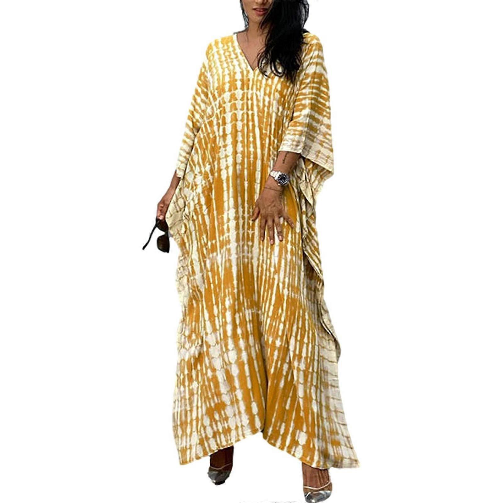 Women Casual Swimwear Cover Short Sleeve Down Sleep Shirt Dress Swimsuit Cover Up Colorful Print V-Neck Beachwear Cover yellow white