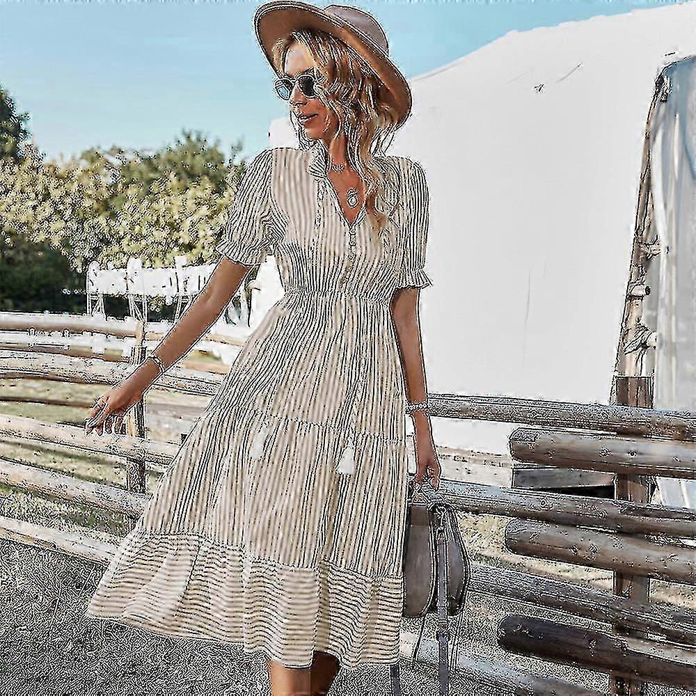 Pattern: stripes Skirt-type: A- line skirt Color: khaki, red, blue, Bean Green Content of main fabric components: 71%-80% Clothing placket: pullover Waist type: high waist Size: S,M,L,XL Content of main fabric component 2: less than 10% Style type: temperament commute Skirt length: mid-length skirt Collar type: v-neck Popular elements: wooden ear, stitching Style: Basic Skirt Category: Dress Style: Young Craft: collage/stitching Material: lightweight fabric, breathable and skin-friendly.The fabric is very soft. You can definitely wear this in special occasions.Show your Elegant and Fashion Temperament. Occasion:Great for casual, outdoor, dating, party, cocktail, night out, evening, dinner, wedding, work, travel, beach, vacation, holiday. It is also very versatile, lending itself well to both day and night looks. A Great Gift For A Birthday, Anniversary, Valentines Day, Christmas, New Year, Thanksgiving. Note: Please refer to the size chart before purchasing to choose the right size.",