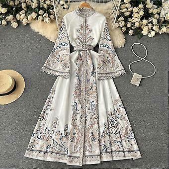 Women's Fashion Spring Fall Flower Pattern Print Long Sleeve O-Neck High Waist Casual Dresses