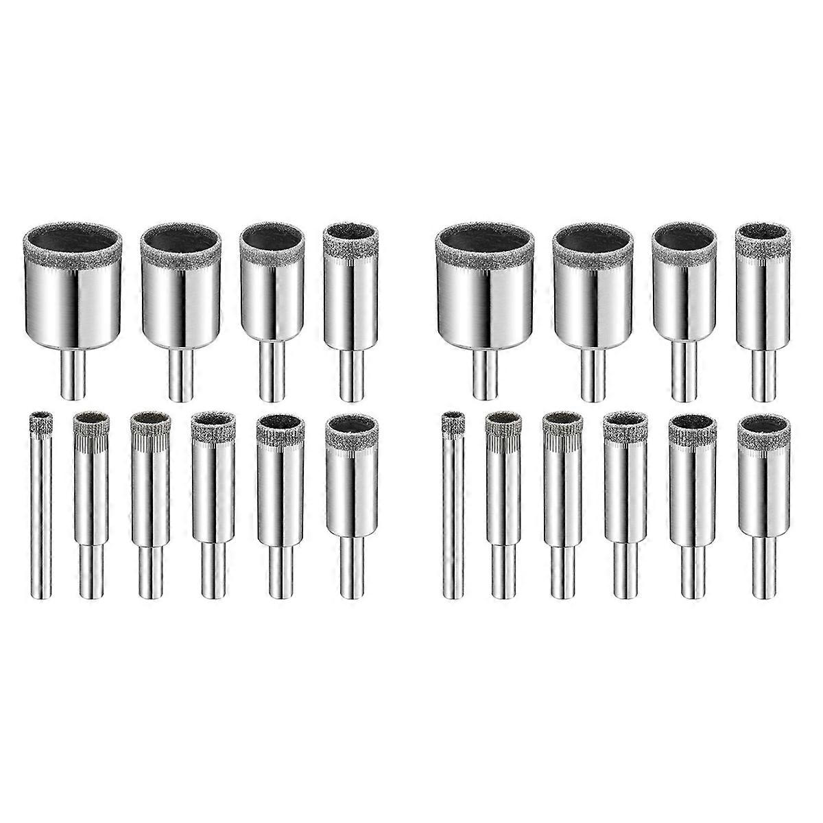 hese drill bit kits are made of upgraded carbon steel with smooth nickel plating to resist , and without edge collapse Coated with high quality diamond to improve drill efficiency and creates a , high precision and smooth cut. 1/4 inch, 5/16 inch, 3/8 inch, 1/2 inch, 16/25 inch, 5/8 inch, 11/16 inch, 3/4 inch, 7/8 inch, 1-1/5 inch,to meet drill needs. Diamond hole saw drill bit set kit are used to drill Glass, Porcelain, Ceramic, Marble, Stone, Bottles, Pots. Color: silver Material: carbon steel Package Contents: 2set diamond drill bits Only the above package content, other products are not included. Note: Light reflection and different displays may cause the color of the item in the picture a little different from the real thing. The measurement allowed error is +/- 1-3cm.
