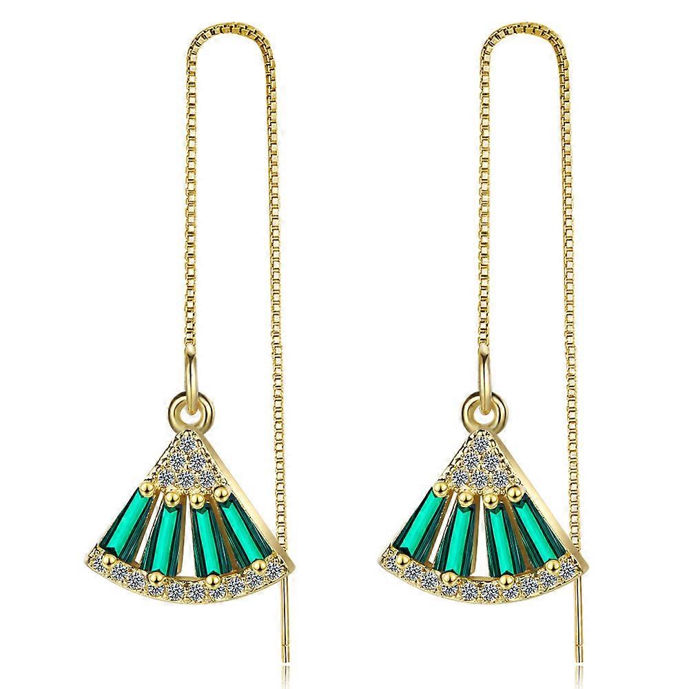 Ear Threads, Long Tassel Emerald Zircon Fan Design, Simple Elegant Copper Korean Style
