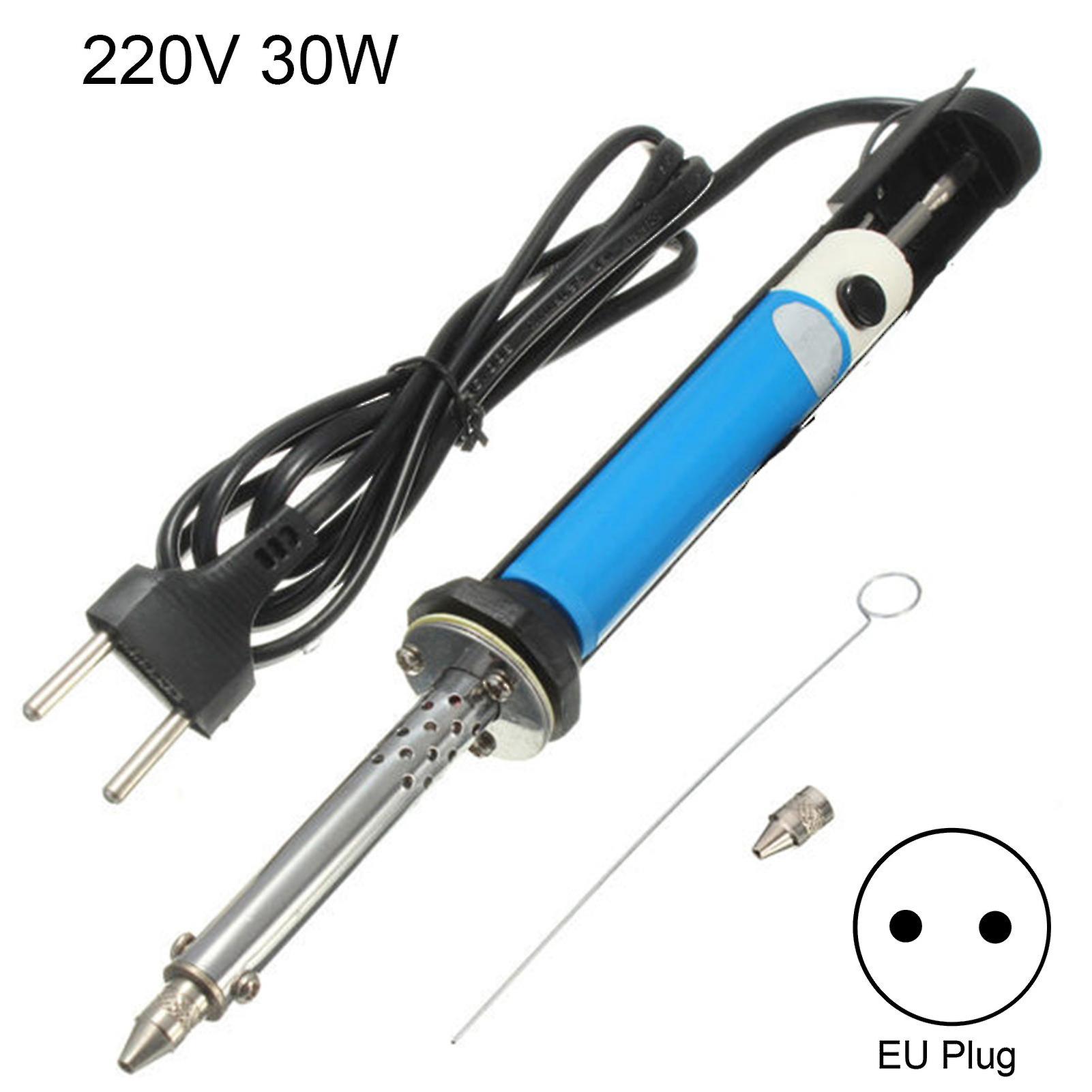 Description:Equipped with 2 tips of different diameter, this electric soldering iron can be used for various applications.High-quality inside components makes the electric soldering iron heat up quickly. And the temperature can be adjusted at will to meet different working requirement.With premium metal and silicone material, this electric soldering iron is practical and durable.This electric soldering iron is 26.5cm long and 2cm wide.It is widely used for electronics, welding, jewelry, guitar, watches, wiring, mobile device, computers hardware, small electronic work, TV capacitors or accessories, etc.Item Name: Electric Soldering IronMaterial: Metal,SiliconeTemperature Range: 200 Degree Celsius - 400 Degree CelsiusPlug Type: US/EU PlugSpecification: US Plug 110V 30W, US Plug 110V 40W, EU Plug 220V 30W, EU Plug 220V 40WSize Details: Size: 26.5cm x 2cm/10.43" x 0.79" (Approx.)Notes:Due to the light and screen setting difference, the item's color may be slightly different from the pictures.Please allow slight dimension difference due to different manual measurement.Usage: 1. Check whether the voltage used is consistent, too high or too low voltage is not conducive to use.2. Tighten the suction nozzle and the air cylinder before use to prevent air leakage, otherwise it will affect the tin suction effect.3. Frequently remove the solder impurities that enter the suction nozzle and the gas cylinder, and add a little oil to the piston.4. After each use, push the piston 3-4 times to remove the residual solder in the straw and make the nozzle and the straw unblocked for the next use.5. After the solder sucker is powered on, it is strictly forbidden to install and disassemble its electric heating parts.6. When the new solder sucker is used for the first time, it may slightly smoke due to the heating of the electric heating element. This is a normal phenomenon, and it will disappear naturally after ten minutes.7. During use, a soldering iron base with natural heat dissipation structure must be used and should be placed in the soldering iron base.8. If the power cord is damaged, in order to avoid danger, it must be replaced by the manufacturer or its maintenance department or similar professional personnel.9. This product has a ground wire, it should be used with a socket with contacts, please pay attention to use, to ensure safety.Connect to the power supply, preheat for 3 to 5 minutes, push down the piston handle, use the head of electric iron to aim the welding spot of the component, wait until the welding spot melts, then remove the control button,the soldering tin will be absorbed into the pump.Package Includes:1 x Electric Soldering Iron1 x PCB Needle Board1 x 1.4mm Tip1 x 2.0mm Tip