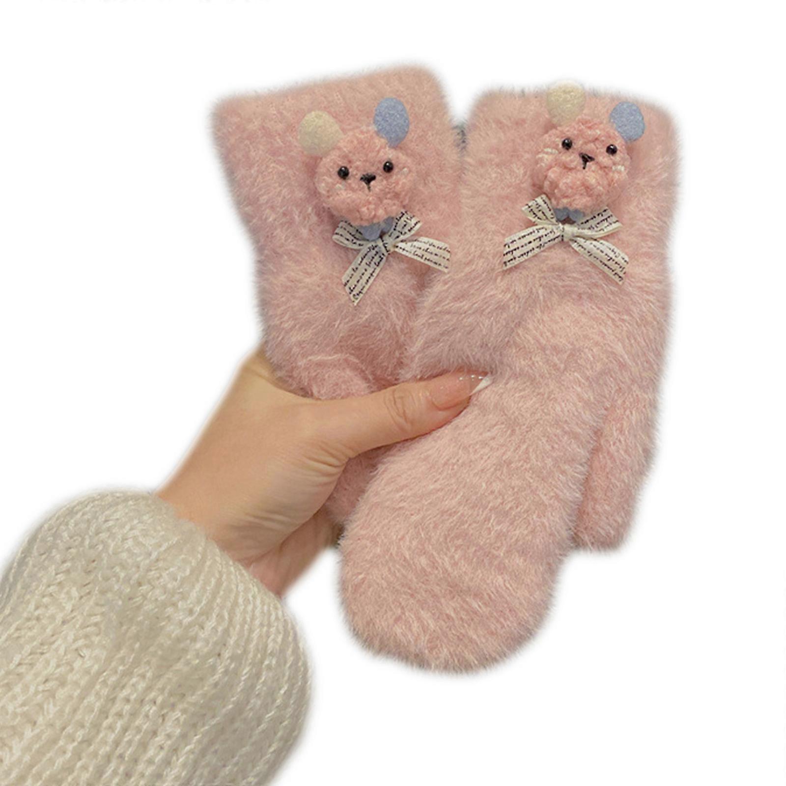 Lovely Rabbit Plush Mittens Cartoon Knitted Gloves for Cold Weather Winter Fleece Lined Full Finger Gloves for Riding pink