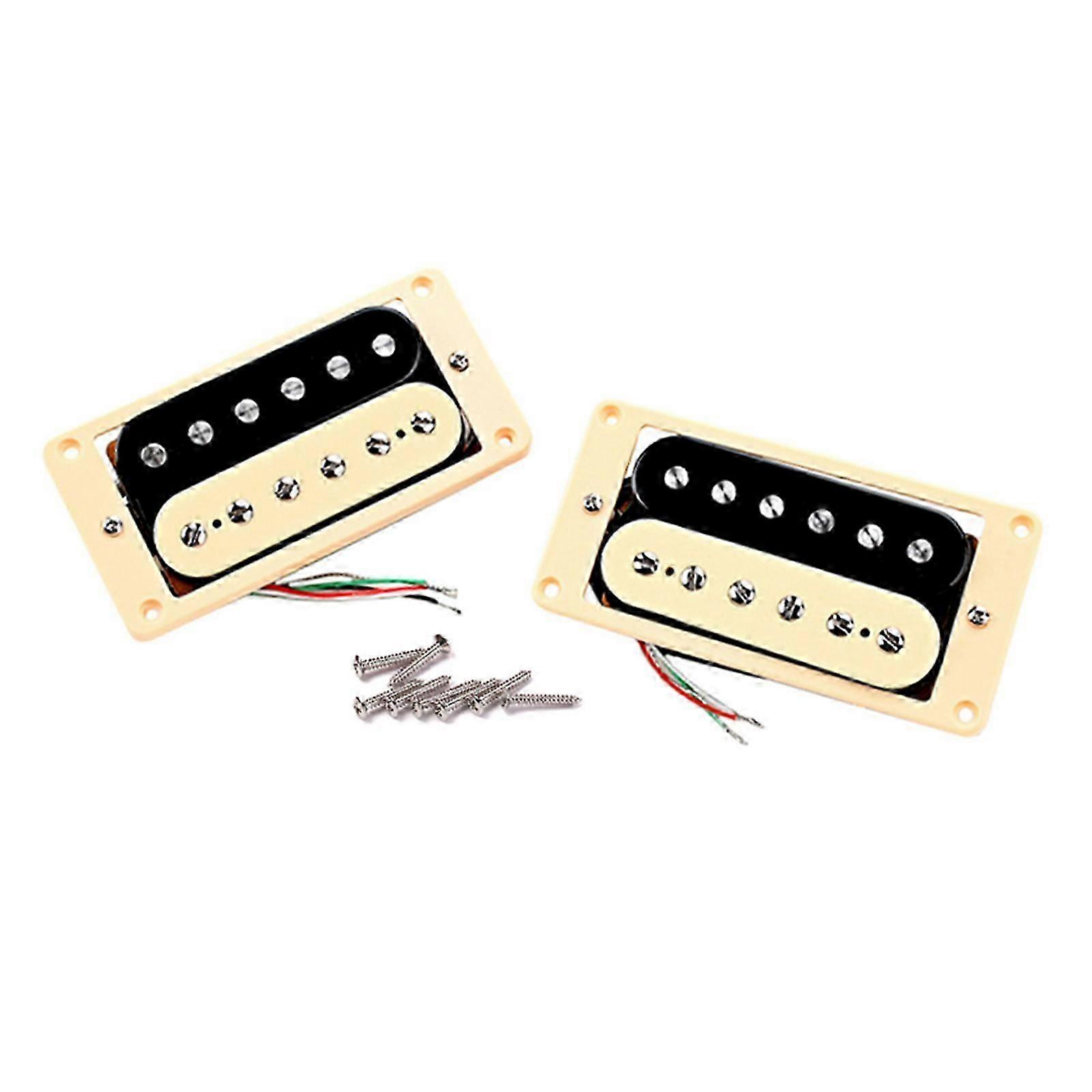 Description Features: A Set of Neck Bridge Pickup Fit for Most Electric Guitar Parts Replacement . Bobbin:Plastic Black + Cream Yellow; Pole Spacing : 50mm neck ,52mm bridge; Magnet: Ceramic. Cable: comes with four-conductor connecting cable to facilitate complex pickup switching setups. Tone Quality: Smooth, warm, clear sound, full of energy. Each pickup comes with 4 screws. Easy to install. Specifications: Material: Metal + Plastic Size: Approx. 92x46x21mm/3.62x1.81x0.83inch Weight: 252g/set Note: Please allow 1-2cm errors due to manual measurement, make sure that you do not mind before you order. Due to the difference between different monitors, the picture may not reflect the actual color of the item. Package includes: 1 x Neck Pickup 1 x Bridge Pickup 8 x Screws