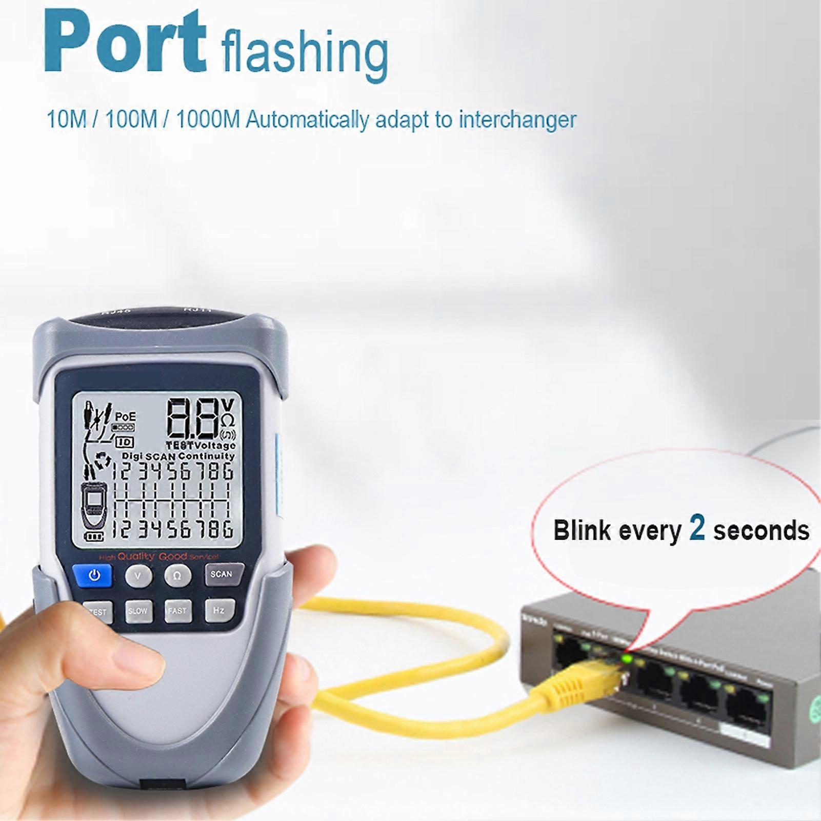 Handheld Portable Network Cable Tester LCD Large Screen Display Digital Wire Trackers Continuity Battery Voltage Polarity Checking POE Test Multi-function Cable Tester with Flashlight This handheld portable network cable tester is a practical tool for all kinds of communication lines and maintenance personnel. It helps you quickly and efficiently find the cable you need from a large number of cables. This product can be widely used in telephone system, computers network, video network, optical communication and other metal wire line occasions. If you need it, come and have a try, it will not let you down. Features: Adopt LCD intuitive display screen for you to see the data more clearly, and with three modes for you to switch freely: POE mode, digital mode and analogs mode. POE testing function: This tool can be used for testing standard and non-standard POE device, it can also test POE voltage, power supplys polarity and power supplys mode. Voltagee test function: You can click "V" to enter the voltage test function, which can measure the battery voltage and voltage polarity and you can press "V" again to enter the POE test mode. You can measure the POE power supplys line and voltage. Adjustable sensitivity: when receiving signal is strong, turn down the sound gear;when receiving sianal is weak, raise the sound gear, which can give you a more accurate testing data. With LED flashlight function, you can turn on the flashlight in time when the light is weak or when you use it at night, so that you can use it normally in a dark environment. Specifications: Material: ABS Type: ET612/ET613 (optional) Power: Transmitter: 3*AA battery (NOT INCLUDED) Receiver: 9V (NOT INCLUDED) Analogue cable tracing: √ Digitalized cable tracing: √ Tracking cables with PoE support: √ Identify wire pairs & quality of wire connections: √ Battery voltage polarity checking: √ Battery Voltage measurment (for reference only): √ PoE voltage polarity checking: √ PoE Voltage measurment (for reference only): √ Split pair: √ Breakpoint checking: √ Continuity test: √ Tracing signal transmission distance: 3Km Output signals level: ~15Vp-p Vibration indication: ONLY ET613 Flashlight: √ Loudness adjustable: √ Low battery indicator: √ Package size: 220 * 148 * 50mm / 8.7 * 5.8 * 2.0in Package weight: 389g / 13.7ounce Packing list: 1 * Transmitter 1 * Receiver 3 * Cables