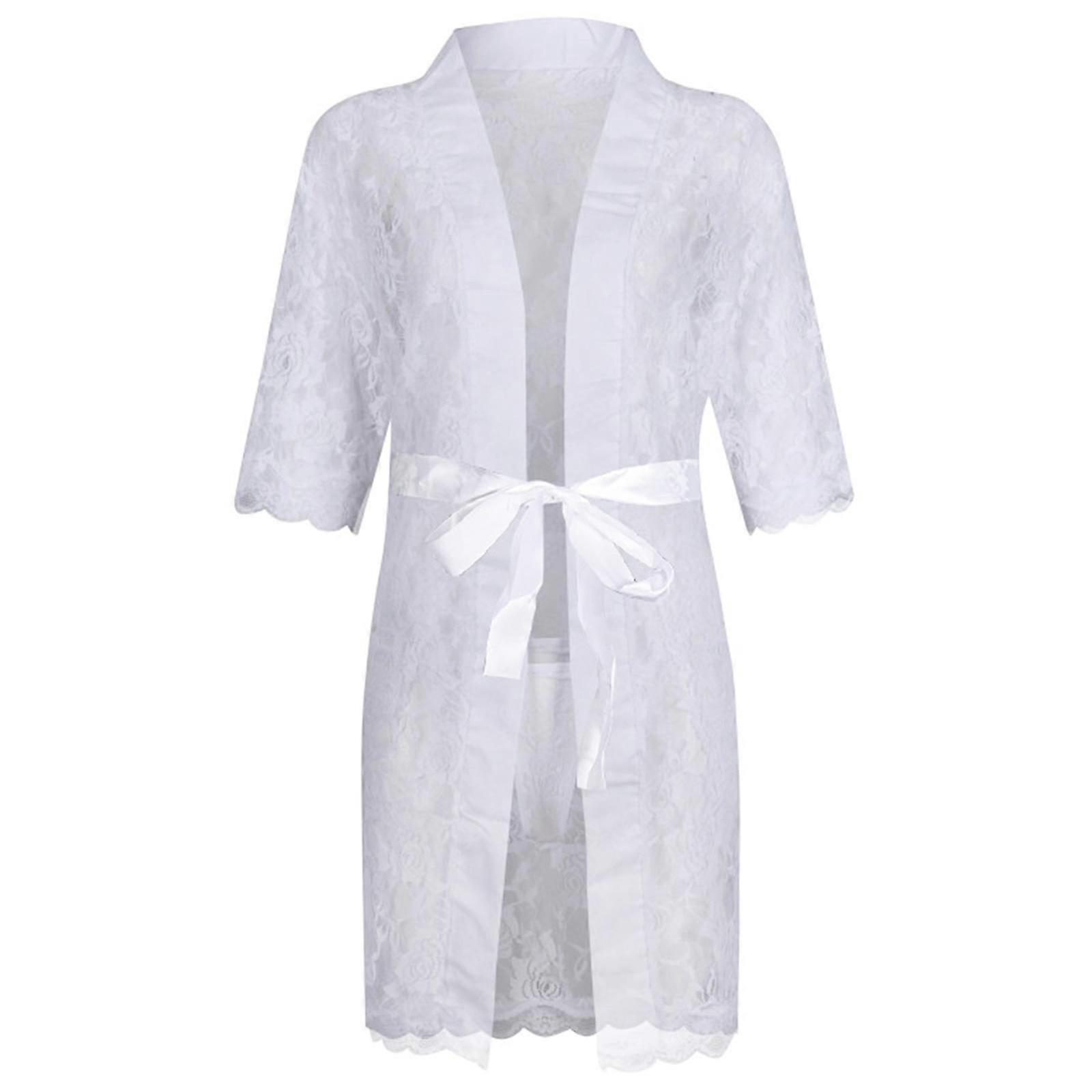 Men's Lace Floral Sheer Night Robe Half Sleeve Cardigan Bathrobe Nightwear Lingerie With T-back Panty Thong And Belt White Xl