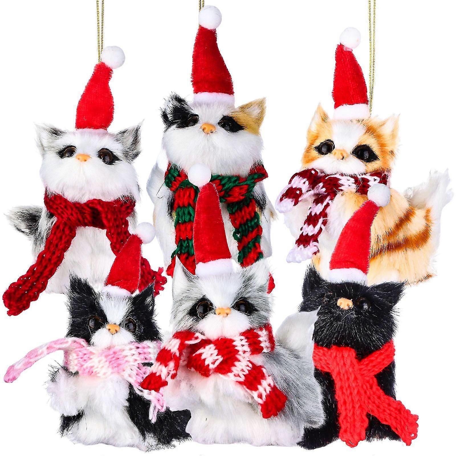 Realistic appearance: mini tabby cat ornaments are made of artificial wool, so they are soft and fluffy to the touch and can give you a comfortable feel. Miniature size: at approx. 3.14 x 1.57 inches, these Xmas holiday hanging cat decorations are befitting for hanging .Their cute shape draws attention quickly and they are also appropriate toys for children Artificial fur kitten ornament with Santa hat and scarf comes with a lanyard at the top, so can easily hang it anywhere want without any other tools, just need to hold the lanyard in place so the kitten won't fall off easily Christmas decorations: Christmas kitten ornaments are decorated with Christmas hats and scarves, these accessories can create a strong Christmas atmosphere Package Include: Cat Ornament For Christmas Decor 6 pcs