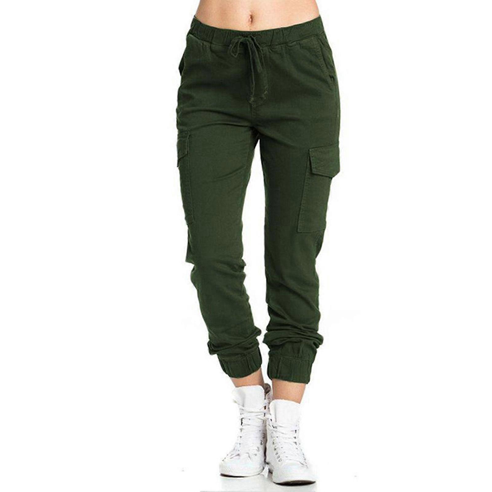 Women Casual Cargo Pants Loose Drawstring Elastic Middle Waisted Trousers with Side Pocket