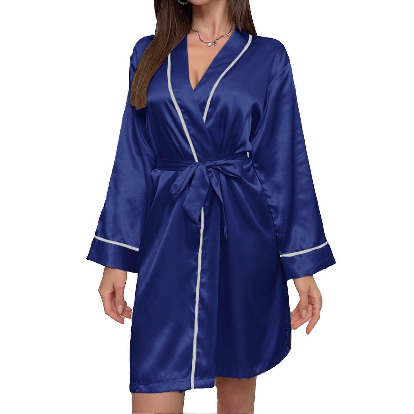 Women Long Sleeves Sleepwear Dress Deep V Neck Waist Belted Casual Satin Nightwear Pajamas