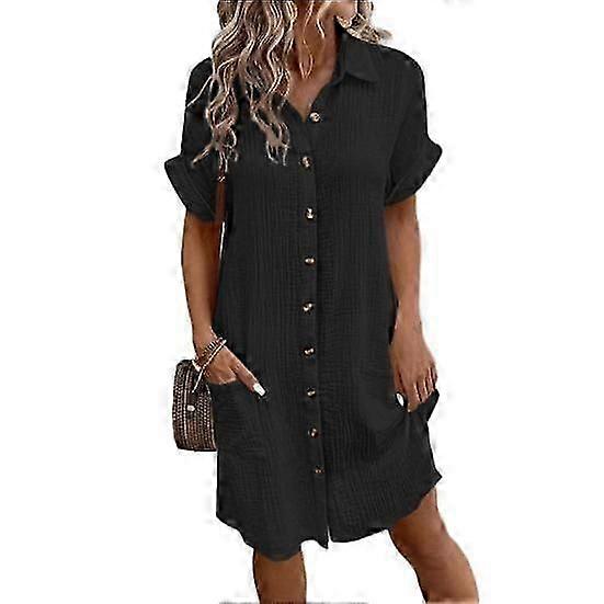 Women Turn-down Collar Single-breasted Loose Short Sleeves Loose Patch Pocket Knee Length Commute Leisure Midi S black