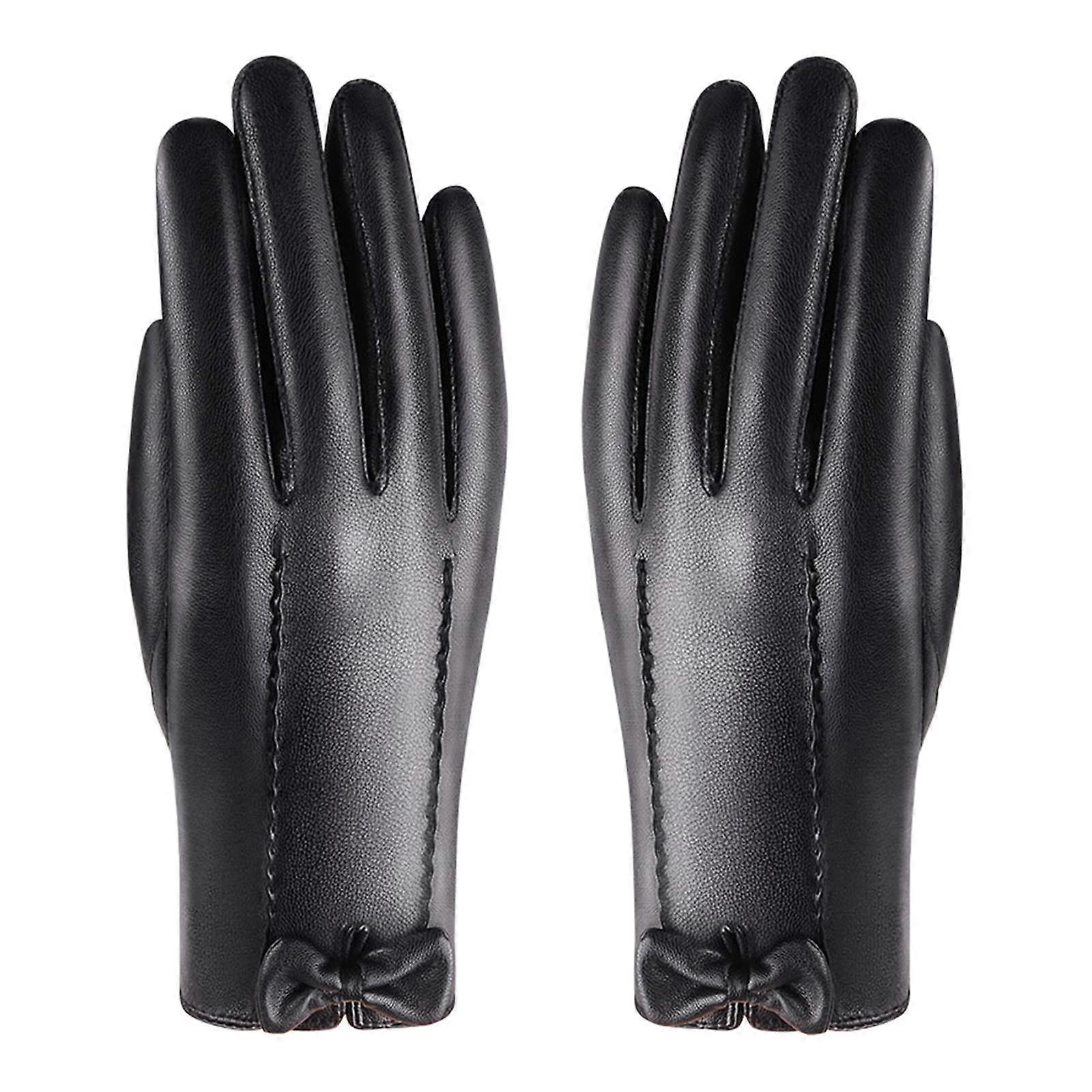 Description: Material: Made of PU leather, very soft and smooth, and can be tucked into a jacket pocket, perfect for autumn and winter weather. Portable: Finely stitched wristband cuffs allow you to put on and take off easily and add a lovely bow decoration on the back of hand. Contact Screen: You can use your mobile phone and contact screen devices normally without taking off your gloves, and your hands will not freeze when playing with your phone in cold weather. Comfort: Fits the hand, doesn't fall off, doesn't feel tight on the wrist, and is more comfortable. Applicable: Suitable for running, cycling, hiking, motorcycle, mountaineering, skiing, and other outdoor activities in cold weather, it is a good choice for relatives, friends, and yourself. Specification: Material: PU Leather Size Chart: Palm Circumference: 18.5cm/7.28inch Middle Finger: 9cm/3.54inch Total Length: 21.5cm/8.46inch Package Includes: 1 Pair Winter Gloves  Note: Please allow slightly errors due to manual measurement and different monitors.