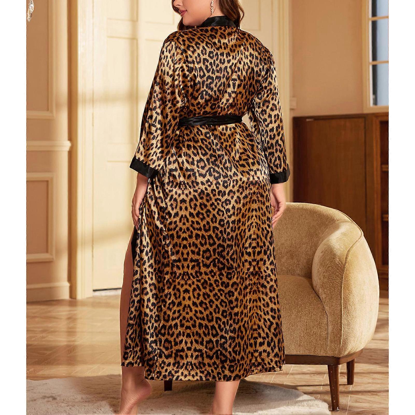 Lady Long Robe 2XL Brown Print V Neck Tie Waist Loose Fit