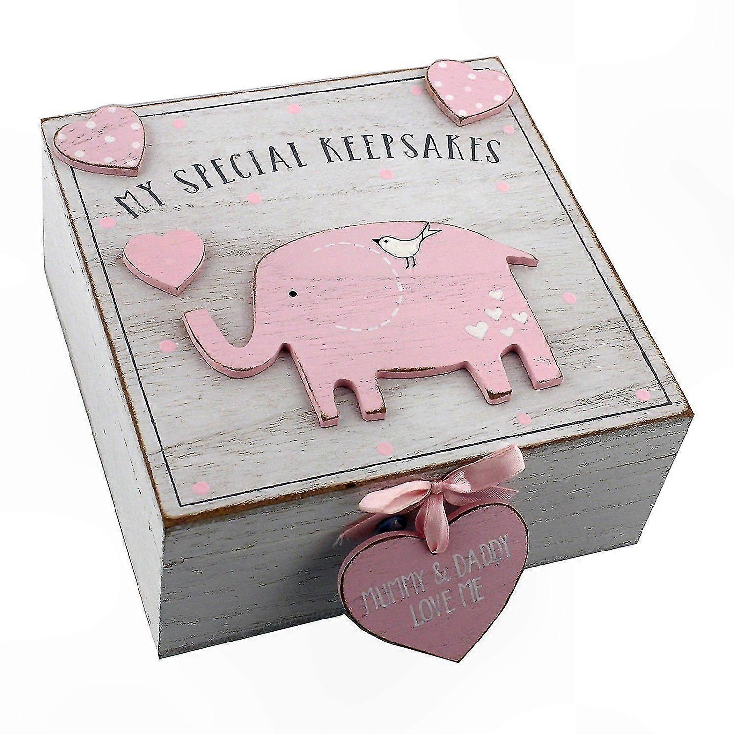 Petit Cheri Wooden Baby Girls Keepsake Box. This special keepsake box is beautifully finished in off white with distressed detail. Complemented by lovely pink polka dots and pretty wooden hearts. The main feature is a cute little elephant. With hinged opening and ribboned heart tag "Mummy & Daddy Love Me." A cute box to store baby's first outfit, first shoes, birth certificate, and other small special keepsakes.