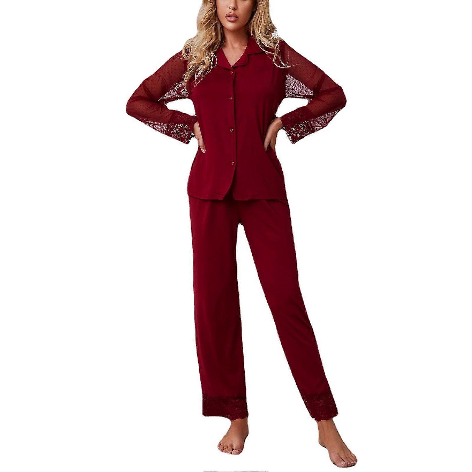 Pajama Set Lace Mesh Long Sleeve Long Pants V Neck Pure Color Single Breasted 2 Piece Sleepwear for Women