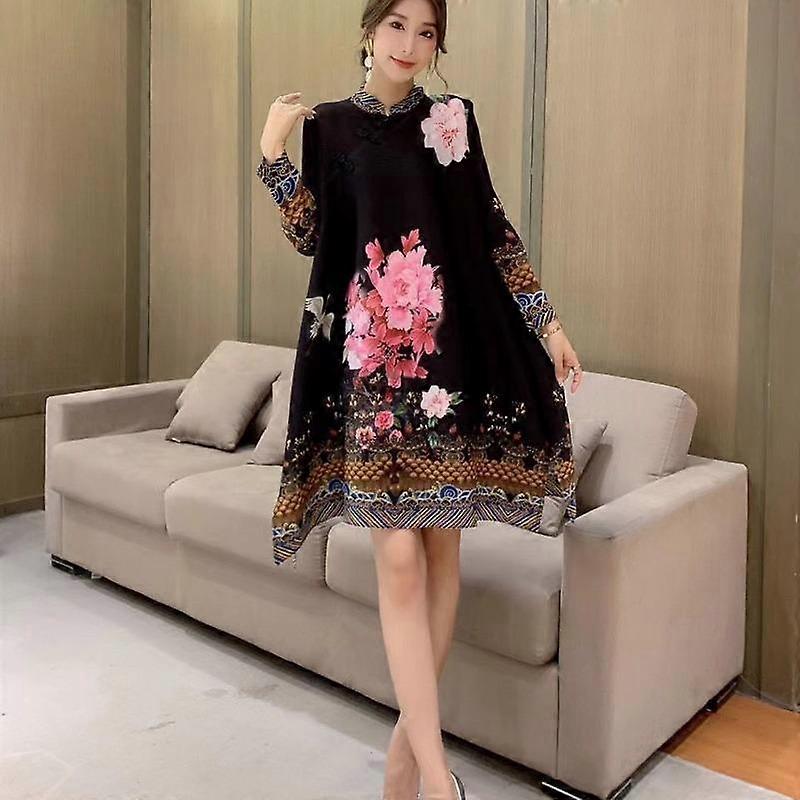 Retro Style Buckle Wide Mrs. Pleated Dress 2022 Autumn New Print Western Style Loose Large Size Woman Dress