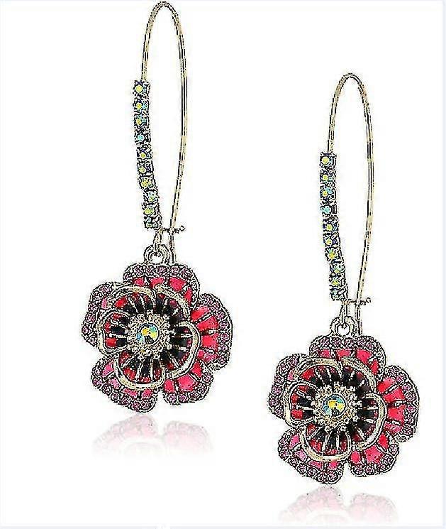 Dangle earrings featuring long ear wire with iridescent stones and pink rose drop embellished with delicate mixed stone accents. Earrings are set in gold-tone metal with a shepherds hook closure. Gold-tone metal with glass and enamel Length: 2.25" Width: 0.8" Shepherds hook closure Imported