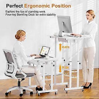 Small Standing Desk Adjustable Height Mobile Rolling Laptop Table for Home Office Workstation, Compact Size, White Finish