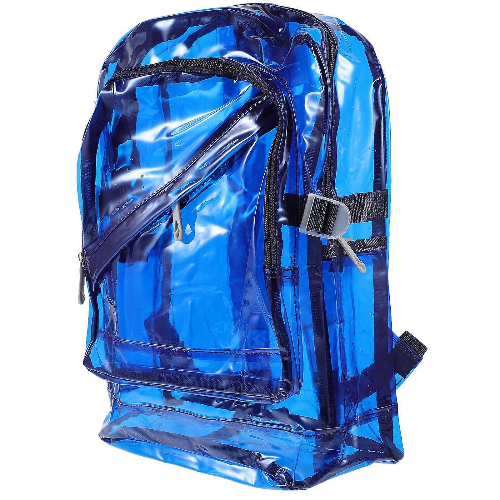 Description This backpack is completely see through all around, including back and bottom. It features with strong structure and comfortable texture with large capacity, which have enough space for holding all of your stationery or cosmetic items. Perfect school packback for girls. Features - Color: Blue. - Material: Plastic. - Size: Approx. 40 * 31 * 12cm/ 16 * 12.2 * 4.7 inch (L*W*H). - Heavily-duty shoulder straps with imppecable craftsmanship for extra durability. - Super Spacious and plenty of room for books and other stuffs. - Transparent backpack, simple, stylish and elegant, perfect for school, summer beach trip, etc. - Adjustable shoulder straps for comfortable carrying. Smoothly zippered design for easy open and well closure. Package list: 1 * Stylish Transparent Backpack School Shoulder Bag Satchel for Boys Girls (Blue)