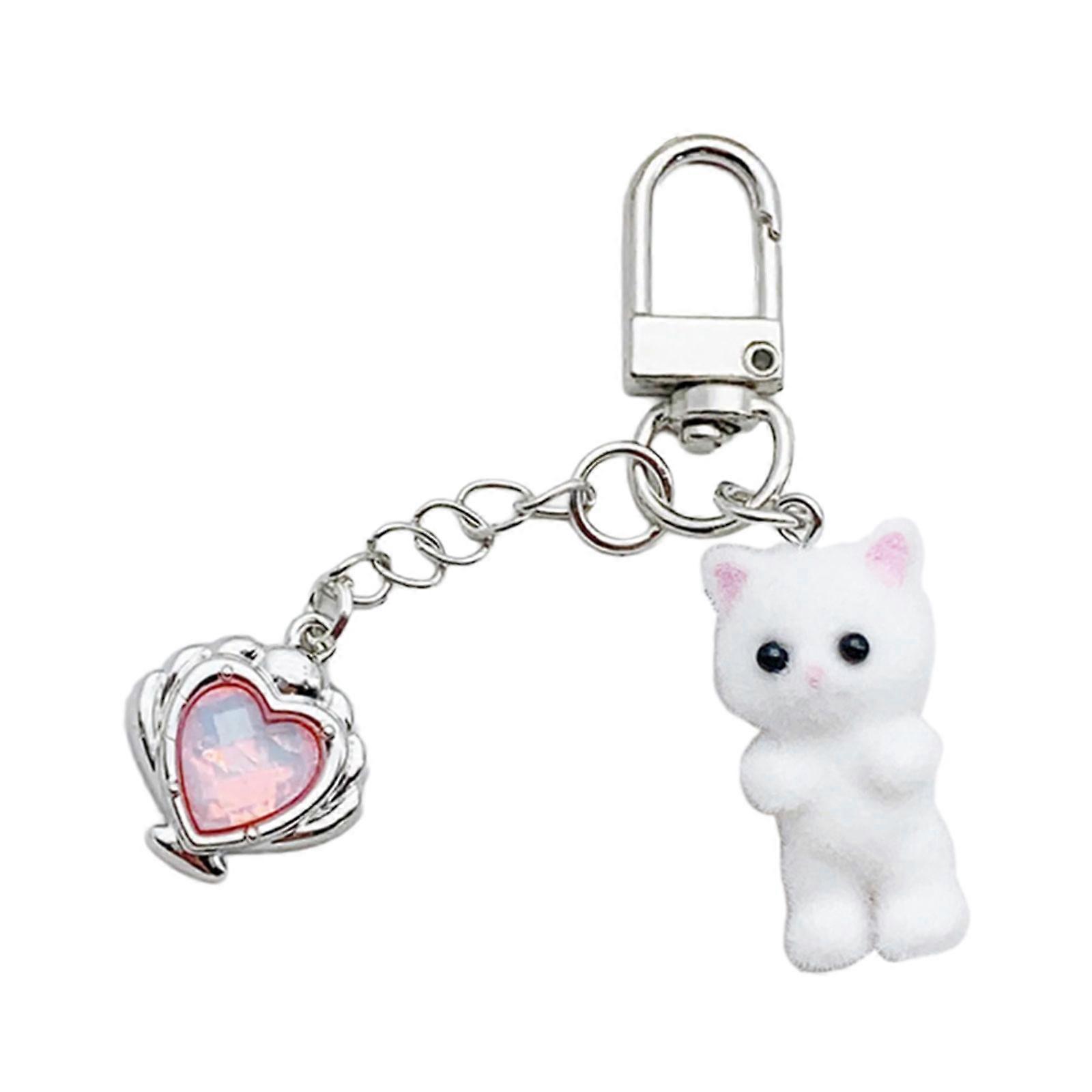 Soft Flocking Cat Key Chain with Bowknot Charm Unique Keyring Pendant Ornament Handmade Animal Key Chain Accessory White
