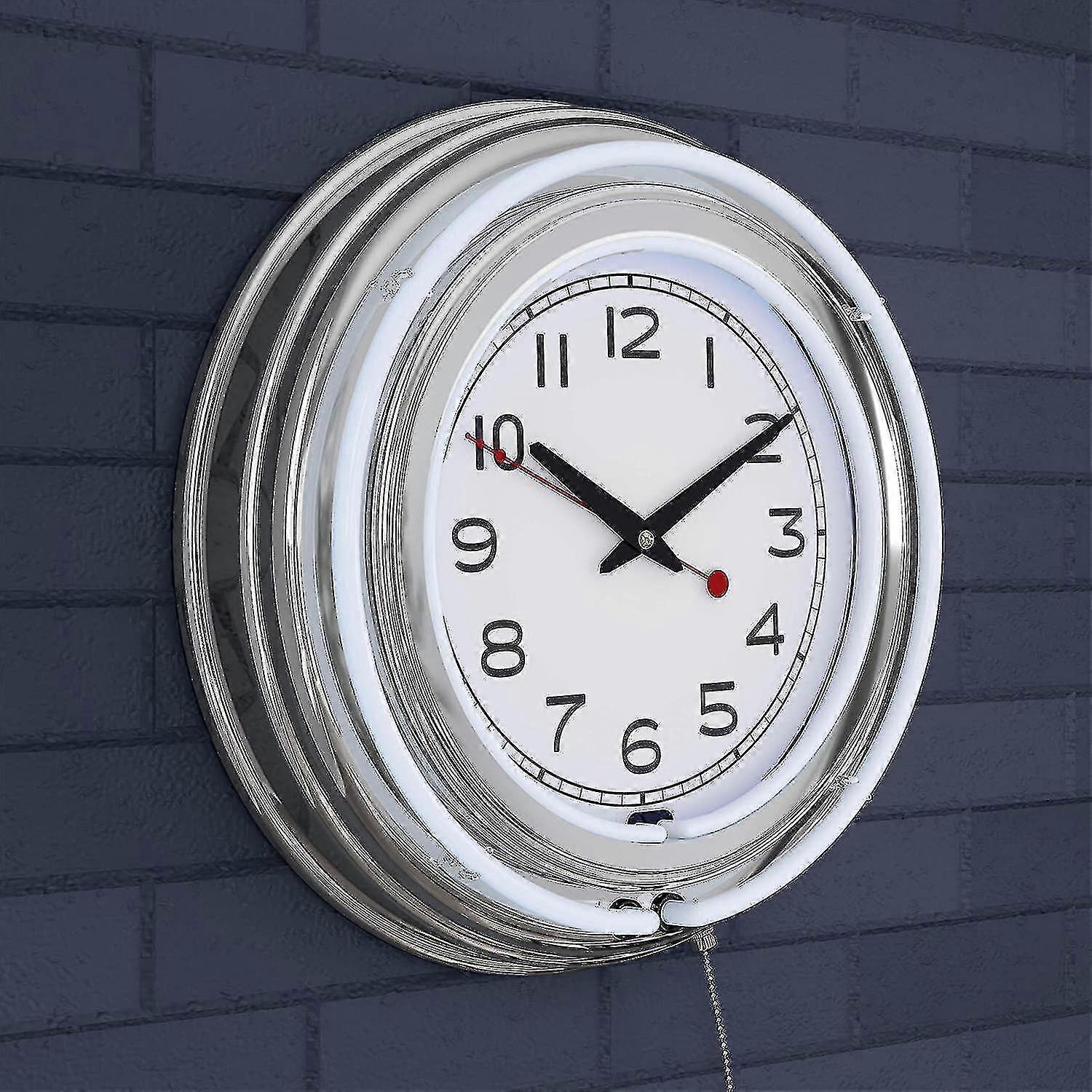 Trademark Gameroom (white Neon Wall Clock-14 Round, Double Light Ring, Dual Power, Analog Quartz Timepiece-retro Dcor For Bar, 14"x14"x3"