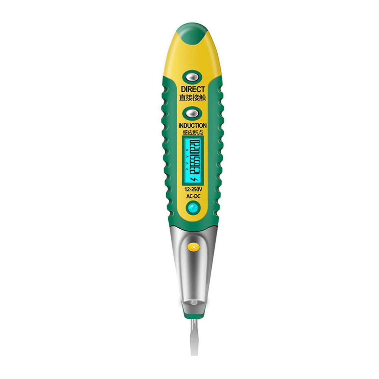 Features: *Line breakpoint detection: Press the "INDUCTION" button to detect along the line, there is a flash symbol at the position without a breakpoint, and the electric symbol will disappear at the position of the breakpoint *Flashlight lighting: press and hold the flashlight button, so that you are no longer afraid of invisible measurement positions in a dark environment, and eliminate the risk of electric shock *Analysis of product layers: chrome vanadium steel/ABS material, smart motherboard, high-definition blue LCD screen, non-contact and safer Night vision blue light digital display screen display: the large digital display screen reads clearly, is easy to use, and can clearly display the value in the dark *One-word batch head: the batch head is forged with chrome vanadium steel, and the overall heat treatment is designed with anti-skid pattern *Portable pen clip design: when not measuring, the electric pen can be plugged and hung on the clothes at any time, and it is more convenient to carry and work Specification: Product model: VD700 Name: Non-contact induction test pencil Electric pen head: one font Product material: chrome vanadium alloy steel, ABS Product features: with auxiliary lighting Product color: yellow green, black yellow, black red Battery type: 3pcs LR1130 button batteries (Battery included) Induction range: can detect 12-250V AC and DC Bit length: 17.3mm/0.68in Total product length: 142.5mm/5.61in Product weight: 21.7g Packing list: 1*Non-contact induction test pen Note: 1. The real color of the item may be slightly different from the pictures shown on website caused by many factors such as brightness of your monitor and light brightness. 2. Please allow slight manual measurement deviation for the data. Made of high quality material, durable and practical to use. Perfect functions,give you a wonderful experience. Every customer can enjoy 30 days refund or replacement for Damaged/Quality Issues. If you have any questions, please feel free to contact us, we will solve it for you. Vd700 Non-Contact Digital Display Induction Electric Pen Multi-Function Test Pen