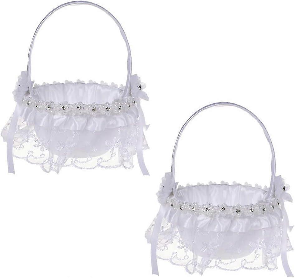 White Wedding Flower Basket, 2 Pcs Wedding Flower Basket Romantic Satin Lace Bowknot Baskets Flower Children Basket Flower Girl Basket for Wedding Par